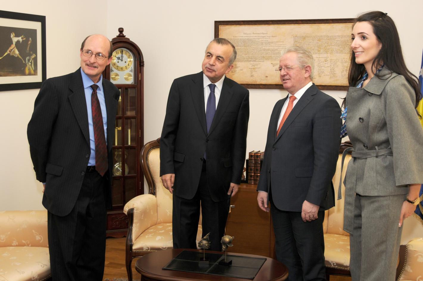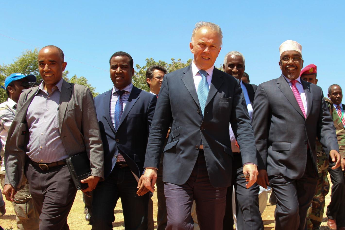 The Interim South West Administration President Sharif Hassan Sheikh Adan (right), Michael Keating, the SRSG for Somalia (second from right) and other delegates on their way to ISWA Presidential Palace during a visit to Baidoa