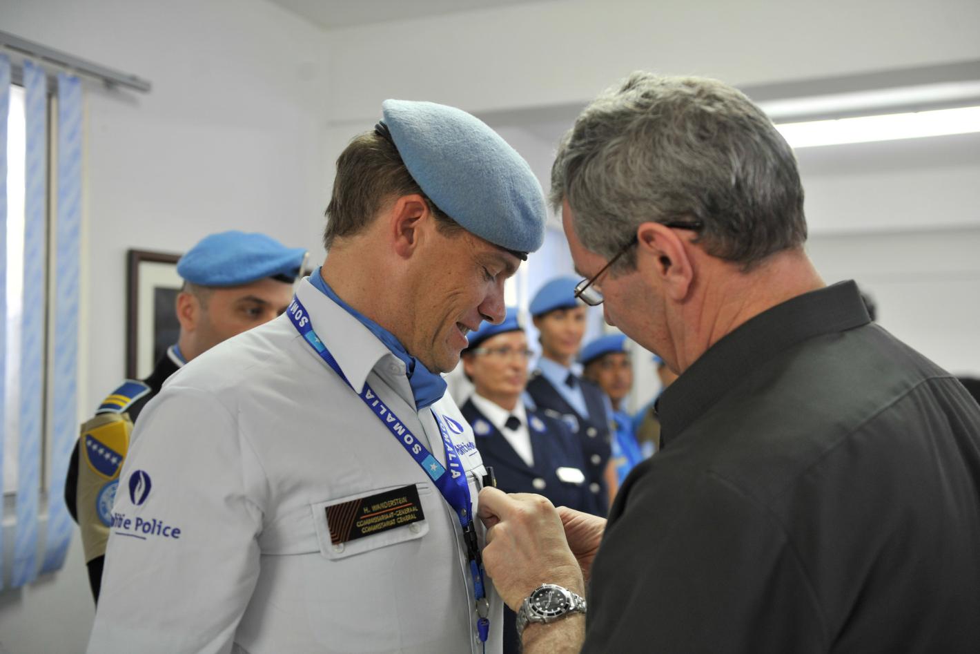 Peter de Clercq, the Deputy Special Representative of the United Nations Secretary-General for Somalia, and resident Humanitarian Coordinator pins a service medal on a member of the UN Police staff.