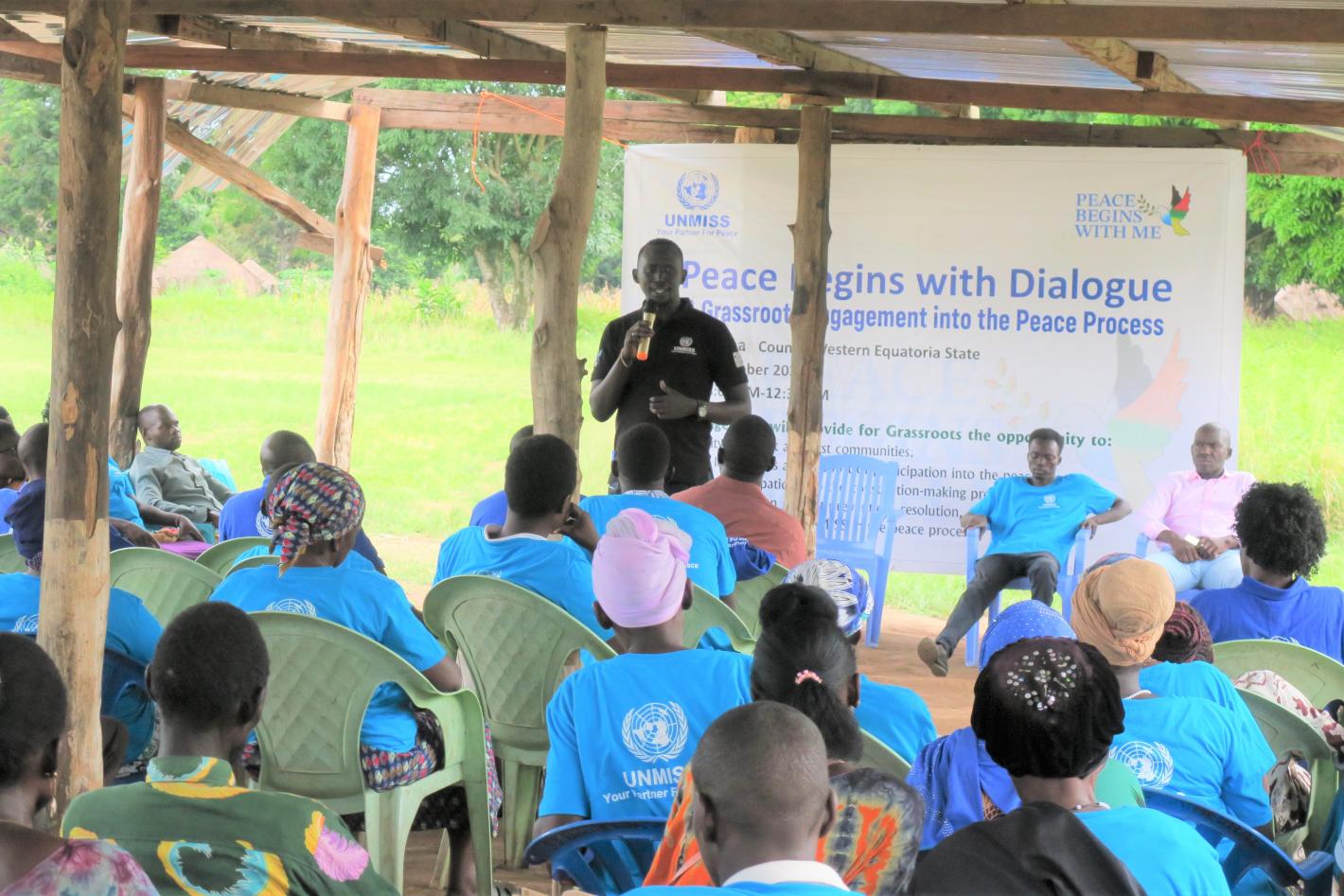 As part of the "Peace Begins with Dialogue" campaign, UNMISS helped unite communities in Ibba, Western Equatoria, around the common purpose of grassroots participation in constitution-making and electoral processes. Photo by Taban Geofrey/UNMISS.