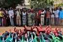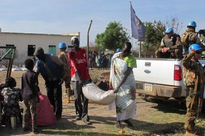 Residents of Unity State capital Bentiu taking food from distribution point after World Food Programme, International Organization for Migration, UNMISS and other partners gave families 15-day rations. Photo: UNMISS/Anna…