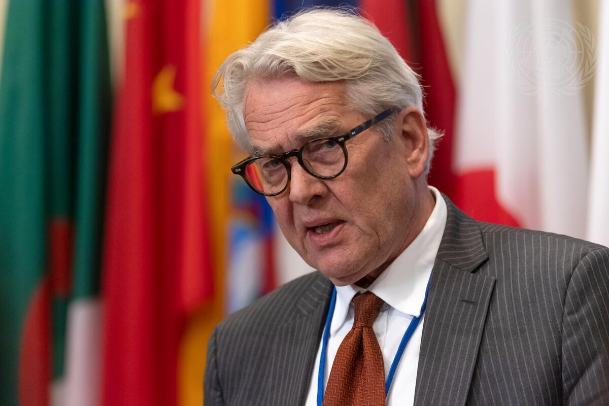 Tor Wennesland, UN Special Coordinator for the Middle East Peace Process and Personal Representative of the Secretary-General, briefs reporters after the Security Council meeting on the situation in the Middle East, including the Palestinian question. (UN Photo/Rick Bajornas - 29 May 2024)