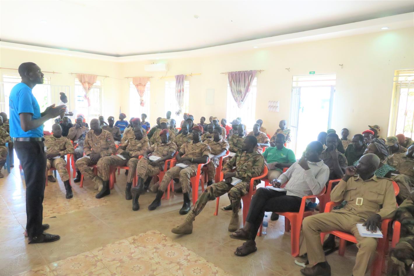 Civilians and military personnel from Central Equatoria state participate in a peacebuilding dialogue in Lobonok. Photo by James Sokiri/UNMISS.