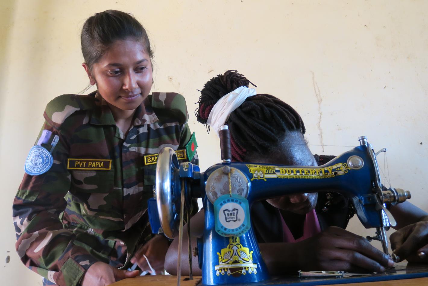 Some 13 young women in Wau, South Sudan, are building income-generating skills in tailoring and sewing thanks to UNMISS peacekeepers from Bangladesh. Photo by Alahayi Nemaya/UNMISS.