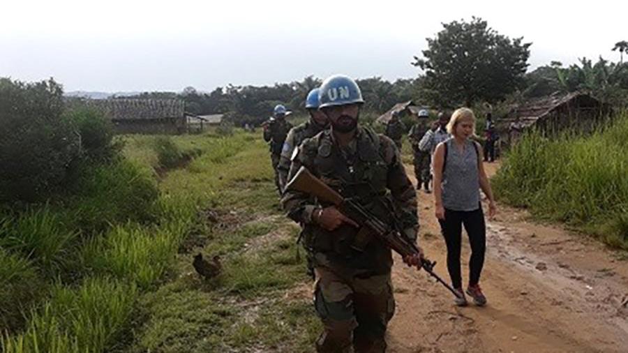 Les éléments du bataillon indien assurent l’escorte des membres des composantes civiles de la Mission, ici la Volontaire ONU Jeanne Warnet. (MONUSCO/Force, 2017)